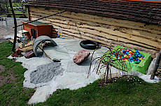 Verschiedene Untergründe wie Rasen, Kies, Sand, Beton, Holz, Verbundsteine und Treppen lernen sie ab der 6. Woche in unserem Aussenbereich mit viel Abwechslung und Spielmöglichkeiten kennen.